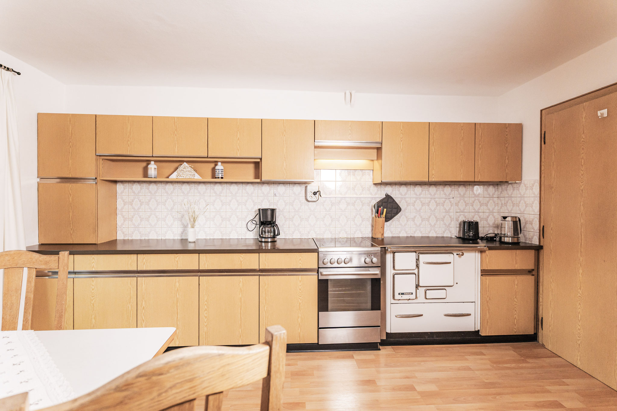 Der wunderschöne Kachelofen sorgt für eine wohlige Wärme und verleiht dem Raum eine besonders heimelige Atmosphäre – ideal nach einem Tag in der Natur oder auf der Skipiste.